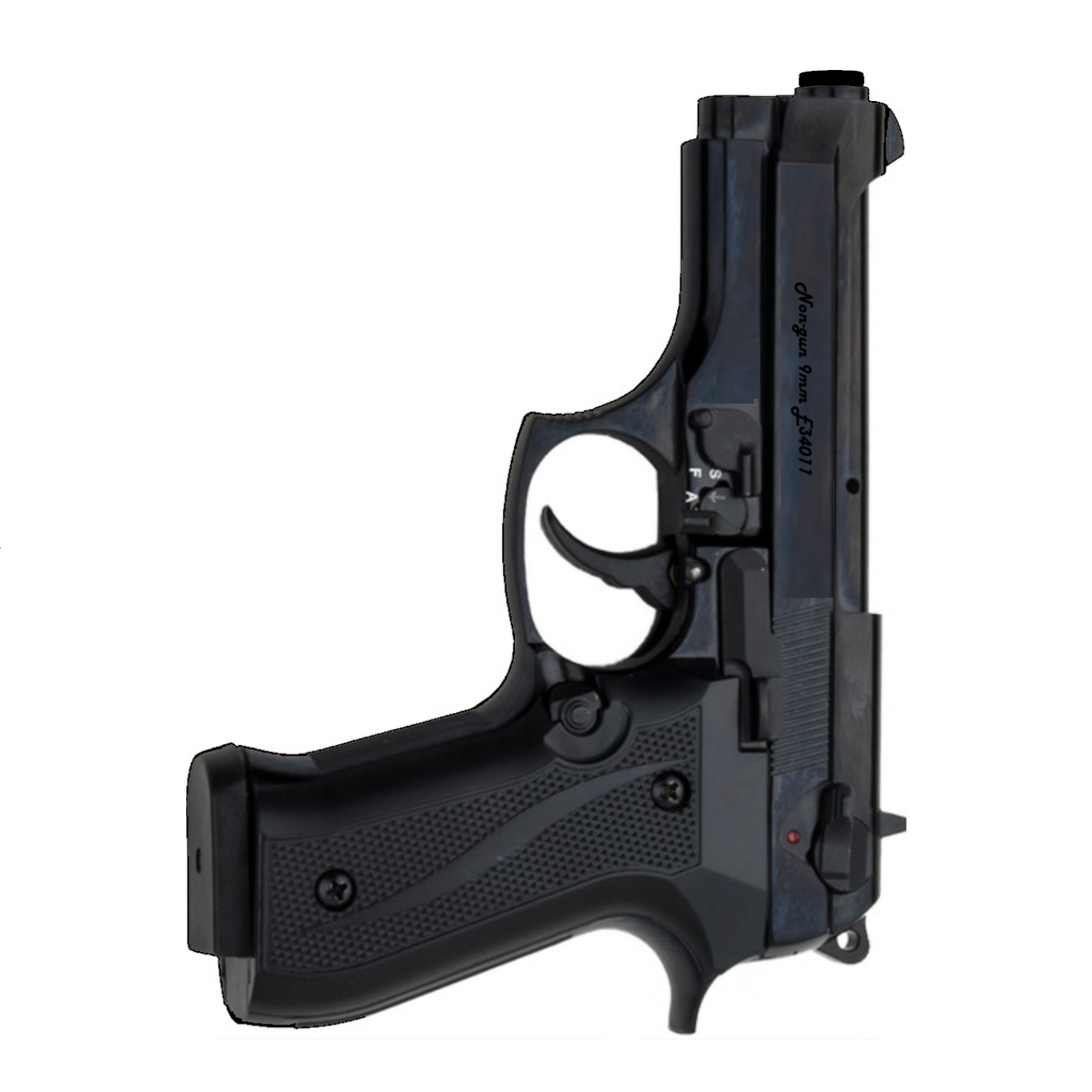 Introducing our fully automatic front firing machine gun pistol simulator. Front firing blank guns raise active shooter training to a whole new level. These are perfect for stage and film as they amplify the experience for your audience. The clip ejects with the push of a button and can be loaded with 13 9mm PAK blank cartridges. The front firing blank pistol has a working fire-selector switch, which changes the pistol over from semi- automatic to fully-automatic. In semi-automatic mode, the pistol fires off one shell with each pull of the trigger. On full-auto, though, the pistol will fire off its 15 rounds in 1.9 seconds, so long as the trigger is held. The Jackal only fires single action. The trigger safety is located on the switch actuator near the trigger where you toggle between semi-automatic and full automatic. The safety switch located near the hammer is not functional and for aesthetics only. All blank firing firearms should be treated like live, working firearms and afforded the same caution, care, and respect. Exercise the same caution and safety with a blank firing firearm as you would with a live firearm, whether it is loaded or not. You must be 18 or older to order and 21 or older to sign for the package. This front firing blank gun cannot be converted to fire live ammo.